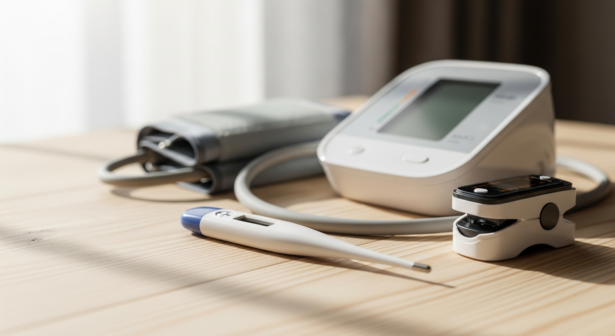 Articolul sugerează că un termometru precis, un tensiometru pentru monitorizarea tensiunii arteriale și un pulsoximetru pentru nivelul de oxigen sunt elemente cheie. Un kit de prim ajutor bine echipat este, de asemenea, crucial pentru situații de urgență.