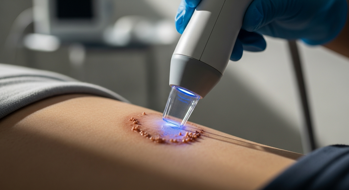 Nu, tratamentul este absolut nedureros. Pacienții descriu adesea o senzație ușoară de răcoare sau un furnicut imperceptibil. Este ideal pentru persoanele cu sensibilitate ridicată la durere.